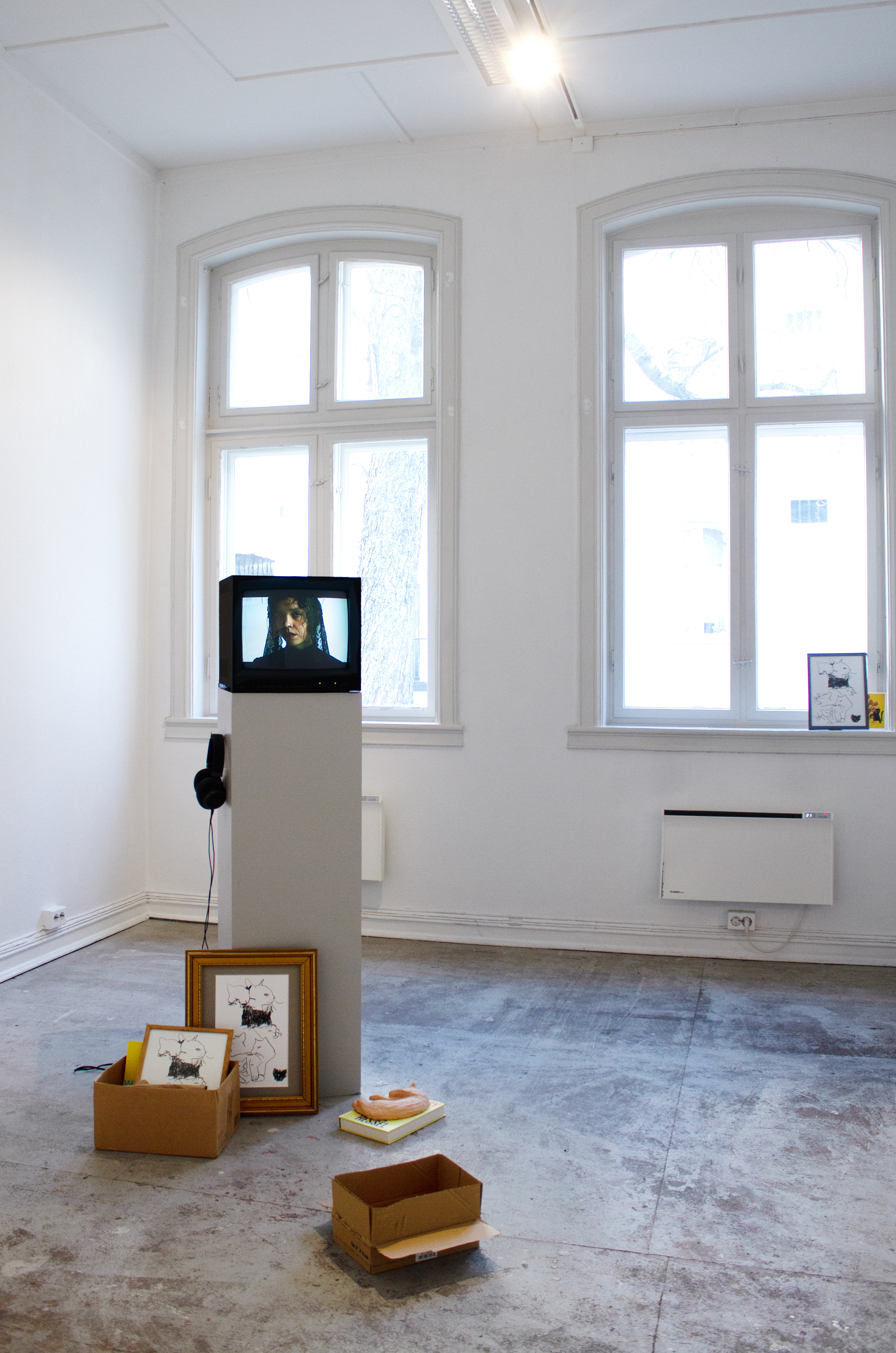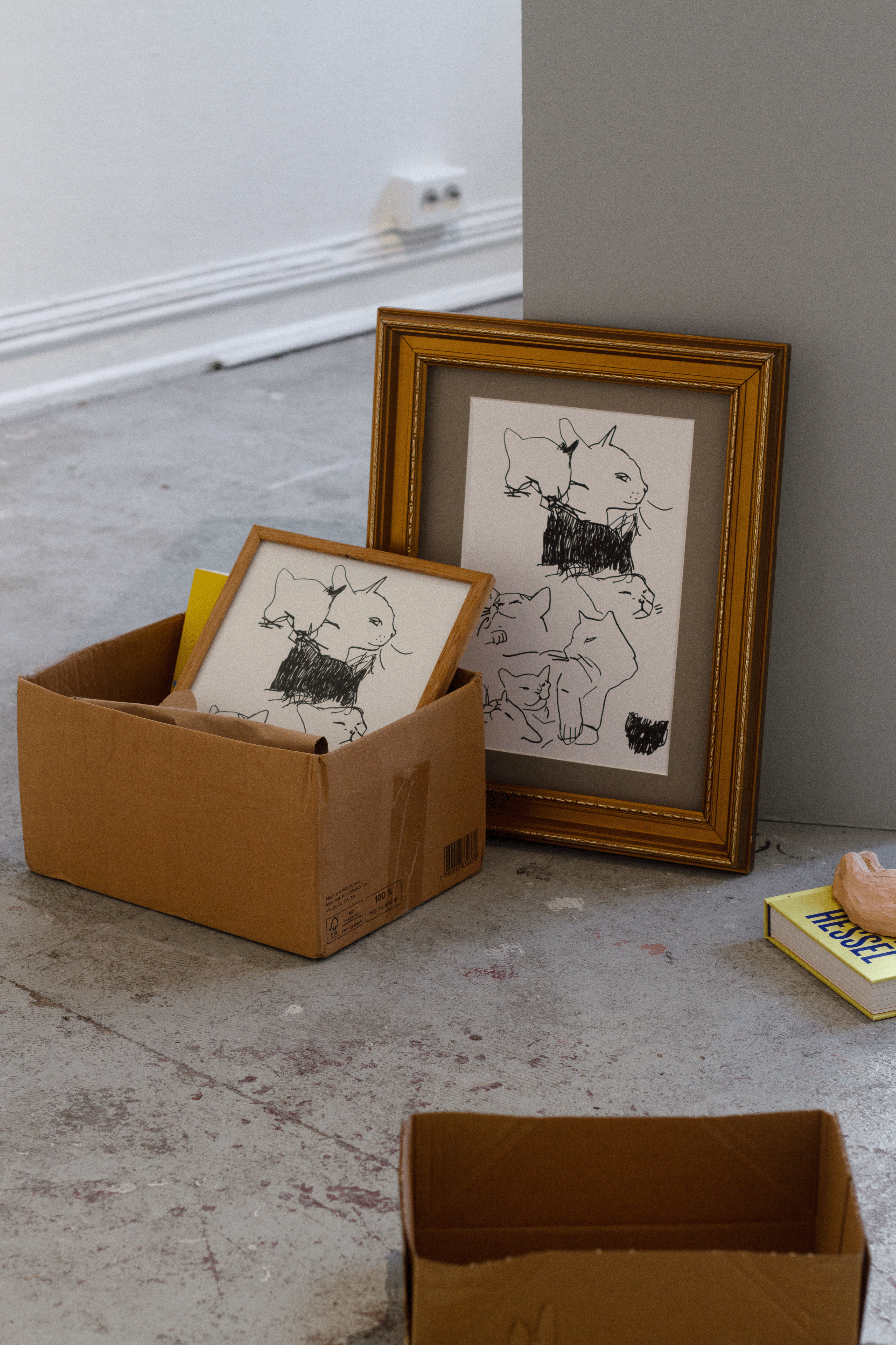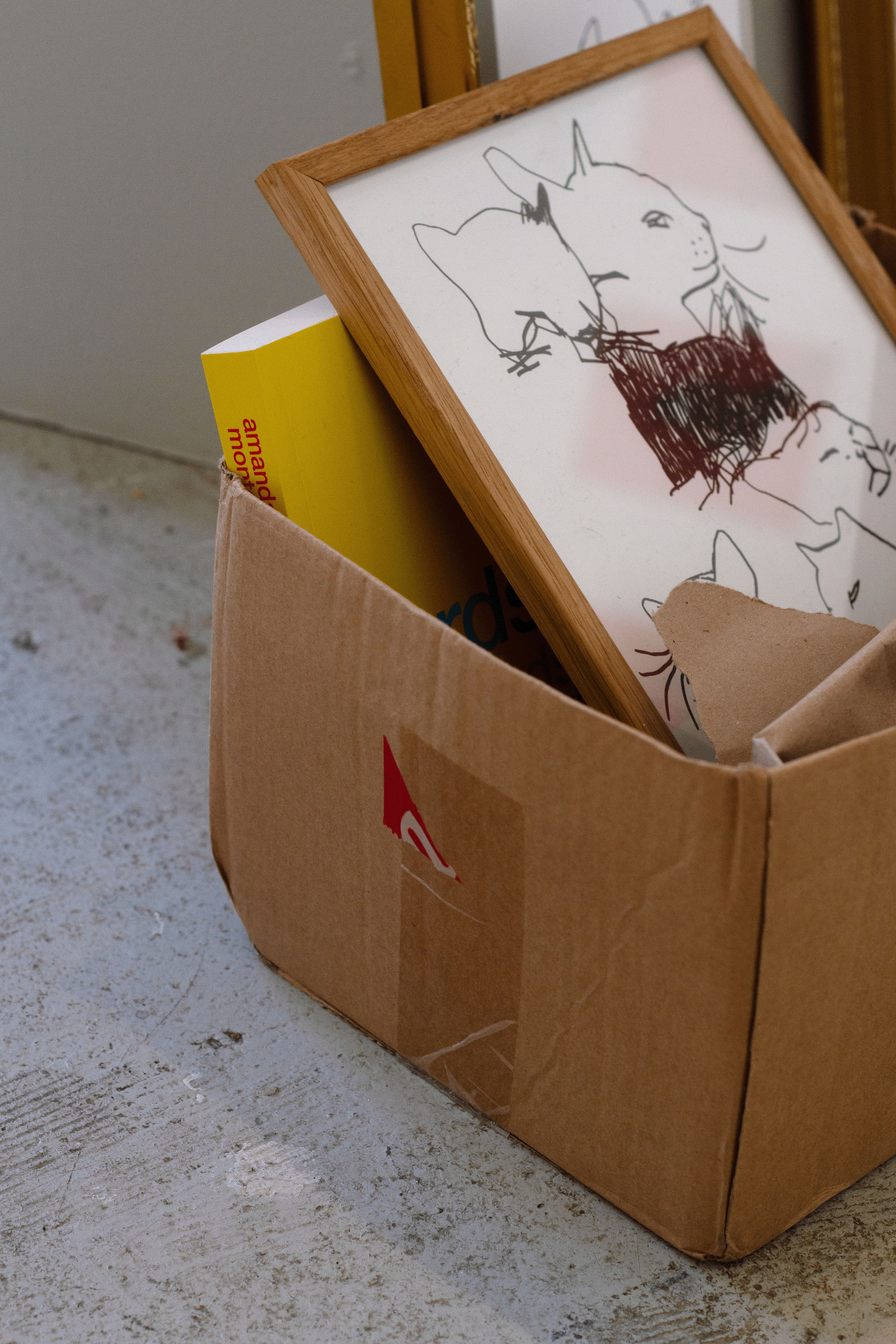 Book («Art history without men» by Katy Hessel), book («Word slut» by Amanda Montell), cardboard boxes and postcards.