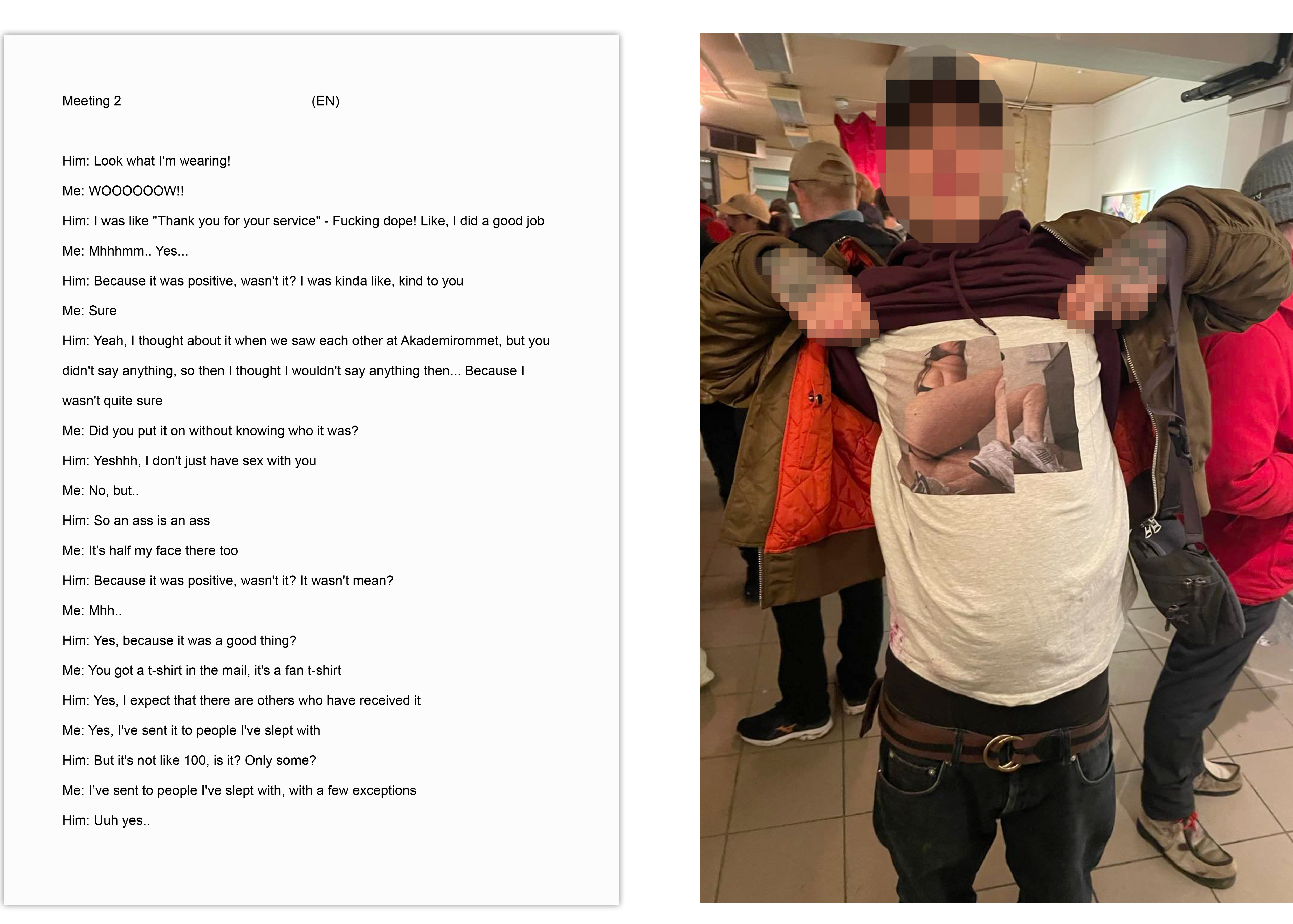 This project consists of T-shirts featuring a print of the artist’s own body, photographed by herself. The t-shirts are sent to people with whom she has had sex with. Exceptions are made due to reasons like sexual violence or unlisted adresses. After the t-shirts are sent, no further communication, such as text messages, are answered.