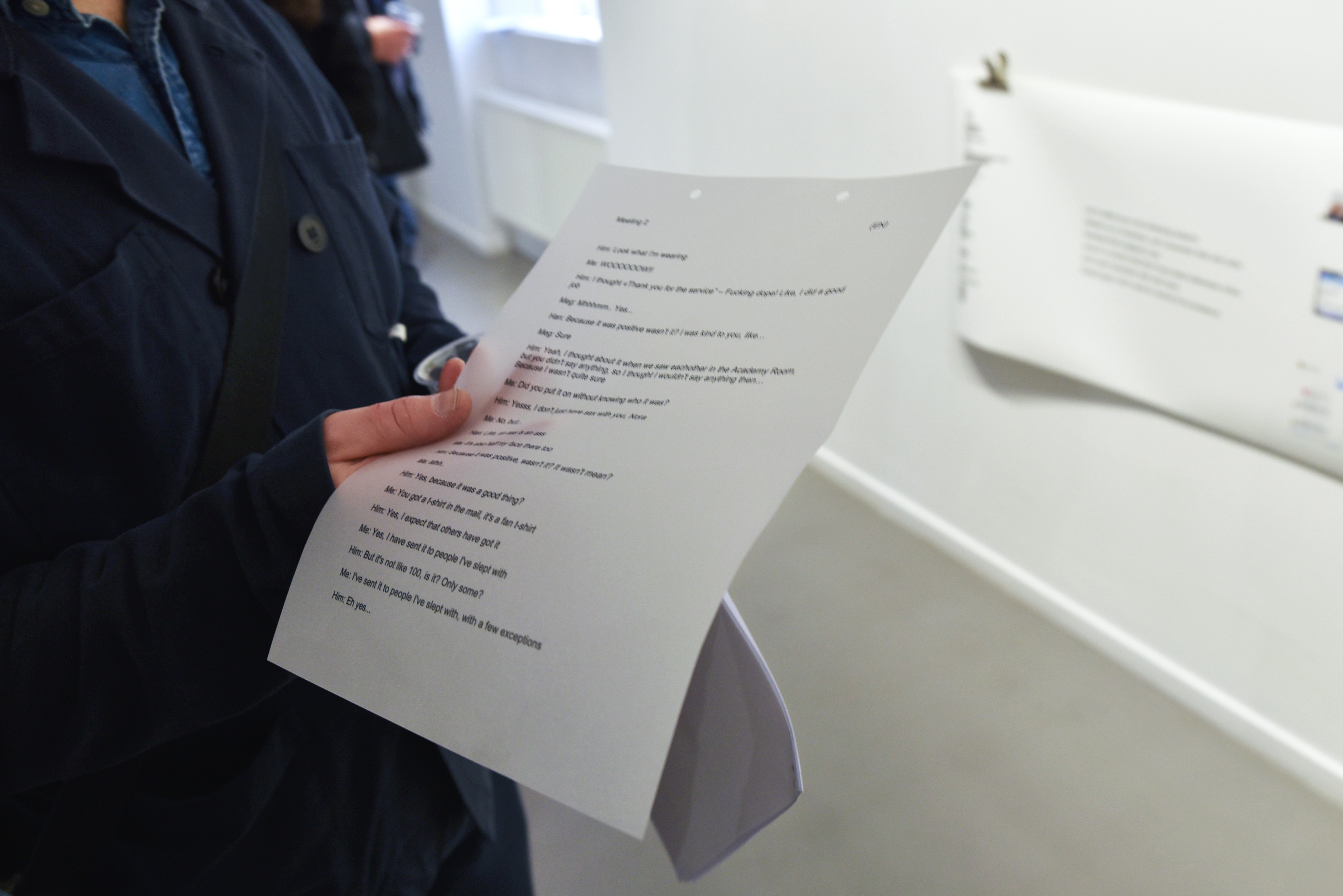 The installation documents the preparation process: packing the T-shirts, shown both as a video and a photo scan of each steps The second part presents the aftermath, including recieved messages, a returned package, and two different meetings with recipients. Both meetings are transcribed; one is displayed separately on the wall and made available in both English and Norwegian for the audience to take.